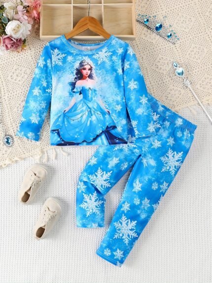 1 Set Girl’s Casual Pajama Set, Ice Princess Snowflake Print Round Neck Long Sleeve T-shirts & Trousers, Comfy & Skin-friendly Set, As Daily Gift