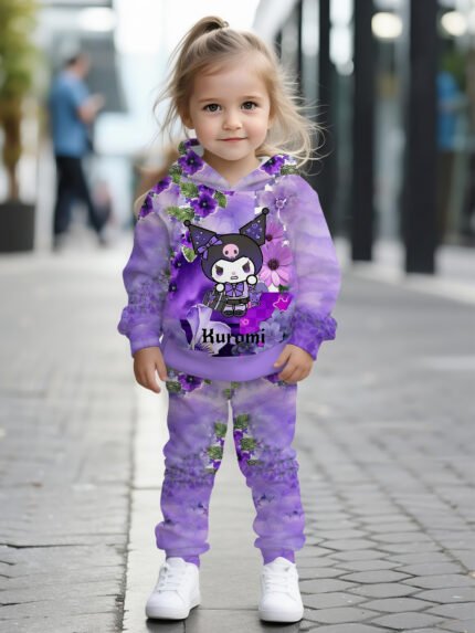 2- Piece Girls’ Set with Kuromi Flower Dreamy- themed Digital Print design, including a hooded sweatshirt and sweatpants. A clothing gift suitable for kids, of comfortable fabric. Suitable for autumn and winter, this casual sportswear set is, Perfect for Outdoor