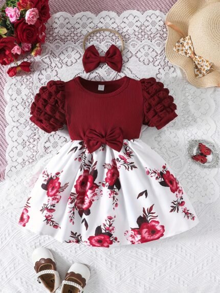 Baby Girl’S Sweet Romantic Print Bubble Sleeve Short Sleeve Dress with Large Bow Headband, Elegant and Stylish Princess Skirt Suitable for Outdoor Activities and Casual Attire, Perfect for Outdoor