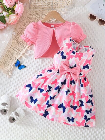 Autumn Baby Girl Cardigan with Bow and Sleeveless Butterfly Print Dress Cute Back-to-School Outfit, Perfect for Outdoor