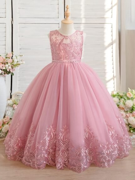 Girls’ Bohemian Floral Print Sleeveless Dress with Beaded Chest & Waistband – Long A-Line Party Dress for Weddings, Christmas, Halloween, Thanksgiving – Elegant Loose Fit Flower Girl Outfit
