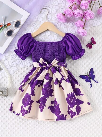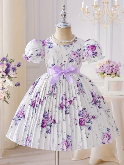 Girls’ Elegant Summer Dress with Purple Floral Print, Puff Sleeves & Ruffled Hem – Knee-Length Pleated Princess Party Dress with Adjustable Waist Tie, Perfect for Parties, Dance Recitals & Gifts, Princess Dresses for Girls