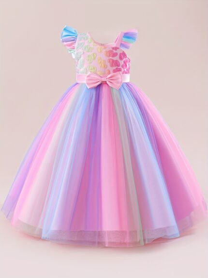 Girls’ Fairy Mermaid Dress with Flutter Sleeves, Gradient Rainbow Princess Long Evening Gown for Parties and Balls