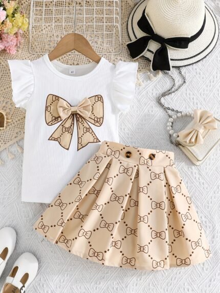 Girls’ Fashionable Plaid Print Skirt Set – White & Black Geometric Pattern, Short Sleeve Top with Bow Detail, A-Line Skirt, Perfect for Summer, Casual Attire|Playful Design|Stretchy Fabric, for Outdoor