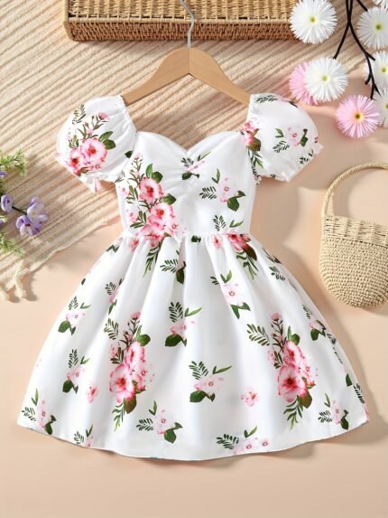 Girls’ Elegant Floral Print Summer Dress – Short Sleeve Puff Shoulder A-Line Machine-Washable Lightweight Pink & Green Floral Print on White for Casual & Garden Party Outfits, Cute Summer Dresses