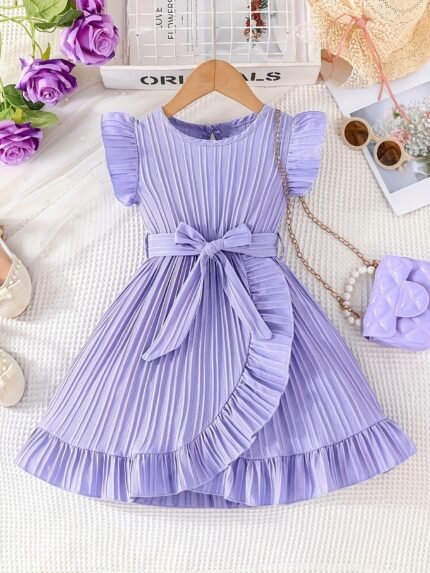 Girls’ Elegant Ruffle Sleeve Dress with Bow Detail – Pink Pleated Mid-Length Party & Casual Dress, Perfect for Summer Outings, Valentine’S Day Gift, and Everyday Wear, Dresses for Girls, Summer Wear, Decorative Bow Detail, Nonstretch Fabric