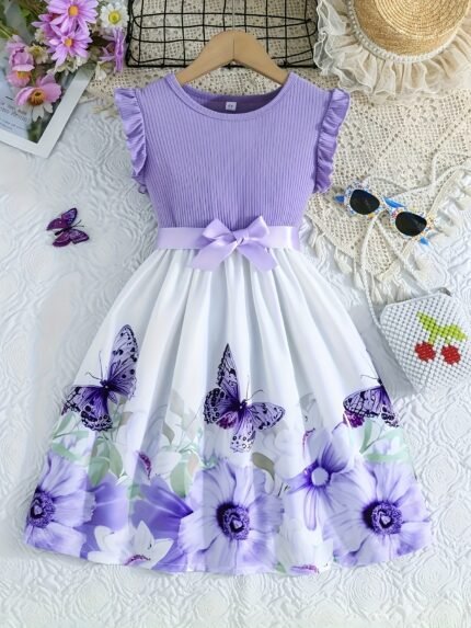 Girls’ Elegant Butterfly & Floral Print Ruffled Sleeve Dress with Adjustable Waist Belt – Lightweight Summer Mid-Length Dress for Birthdays, Parties, Casual Outings & Daily Wear, Butterfly Dress, Party Attire, Decorative Bow Detail, Medium Elasticity Fabric