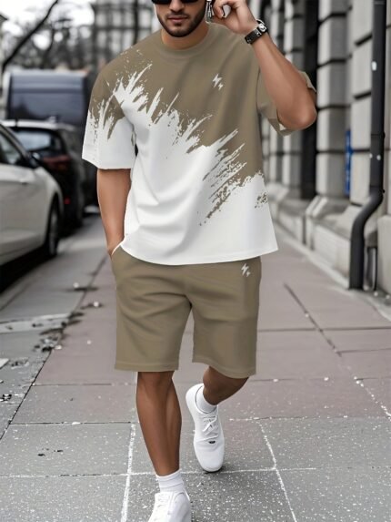 Summer New Casual Round Neck Short Sleeve T-Shirt Set, Lightning Pattern, Sports Leisure Style, Breathable Fabric, Fashionable Minimalist Style, Suitable for Beach Sports