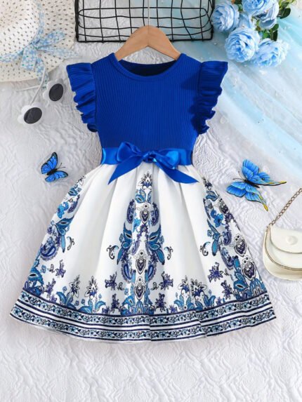 & Little Girls’ Royal Court-Style Princess Dress with Ruffled Short Sleeves & Blue Floral Skirt – Machine-Washable Summer Party Outfit for Performances, Weddings, Photo Shoots, Princess Dress, Performance, Elegant Court Style, Comfortable Fit, Ruffled Hem, Kids Formalwear