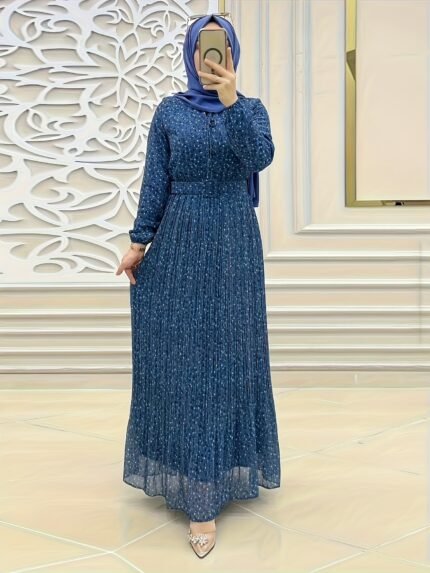 Elegant Blue Floral Patterned Abaya with Rhinestone Belt – Long Sleeve, Floor-Length Dress for Women, Perfect for Casual or Formal Occasions, Formal Attire|Floral Pattern|Rhinestone Accents, Abaya Dress