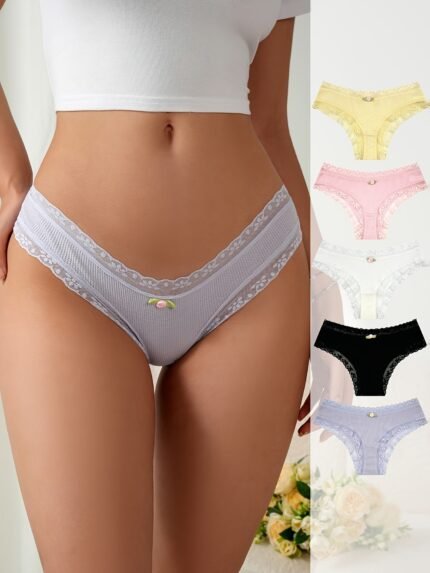 5pcs Women’S Lace Trim Thongs – Elegant Low-Rise Breathable Quick-Dry Underwear with Bow Detail, Assorted Colors (Pink, Yellow, White, Black) – Soft Comfort Fit for Casual Attire, Cute Underwear, Quickdry Underwear, Bow Detail Underwear, Comfortable Fit
