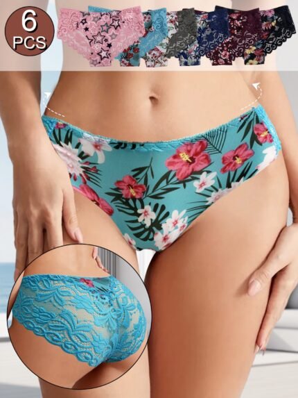 6pcs Women’s Contrast Lace Trim Briefs – Floral & Tropical Print Semi-Sheer Underwear, Romantic Summer Vacation Style, Hand Wash Only, Assorted Colors, Lace Panties, Feminine Undergarments, Feminine Lingerie, Lightweight Undergarments, Stylish Undergarments, Feminine Style