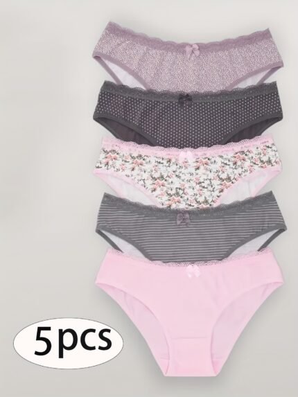 5-Pack Women’s Triangle Panties with Floral Print, Nude Comfortable Soft Stretchy Large Size Underwear with Bow Decoration, Simple Elegant Breathable Briefs – 2025 New Arrival