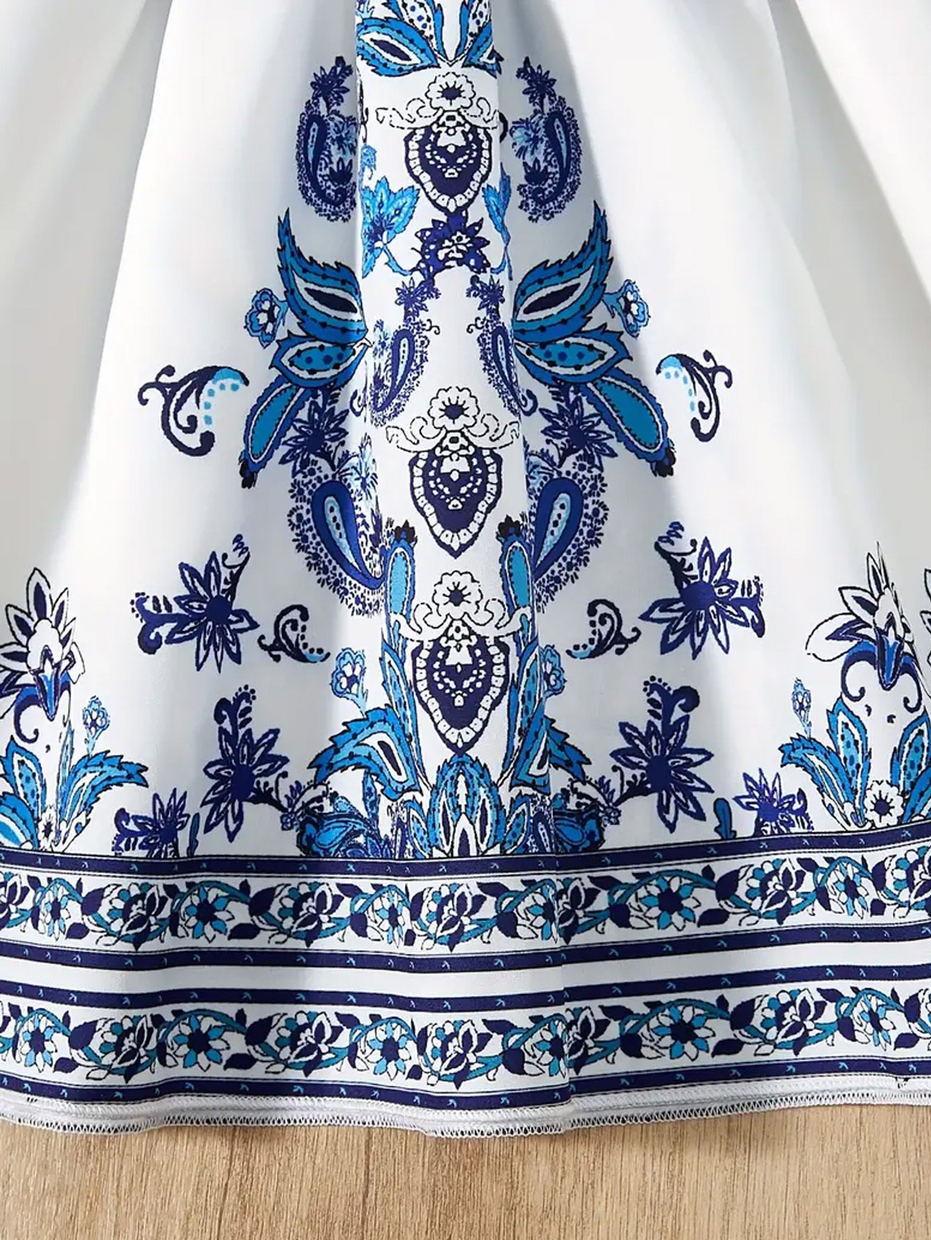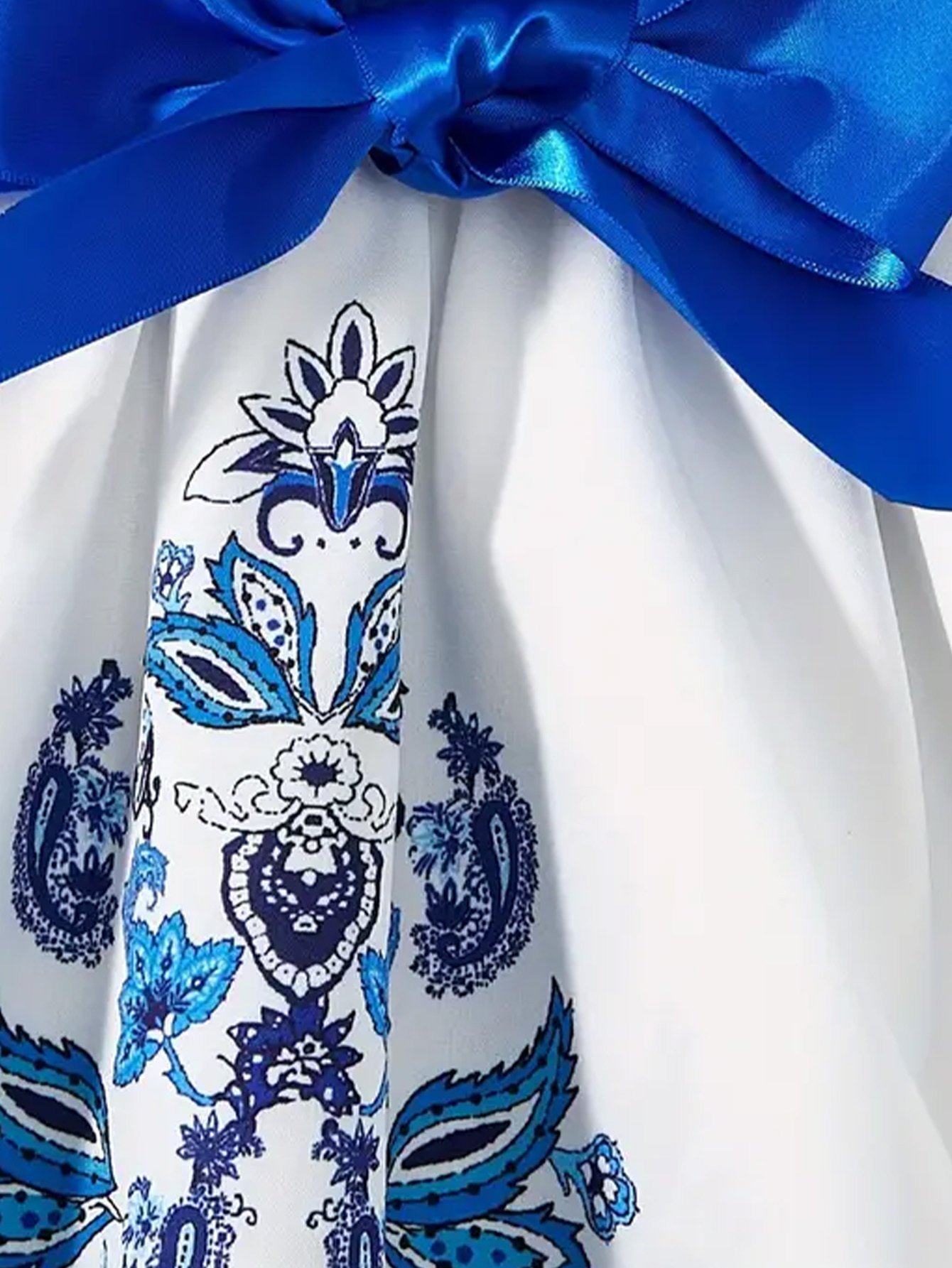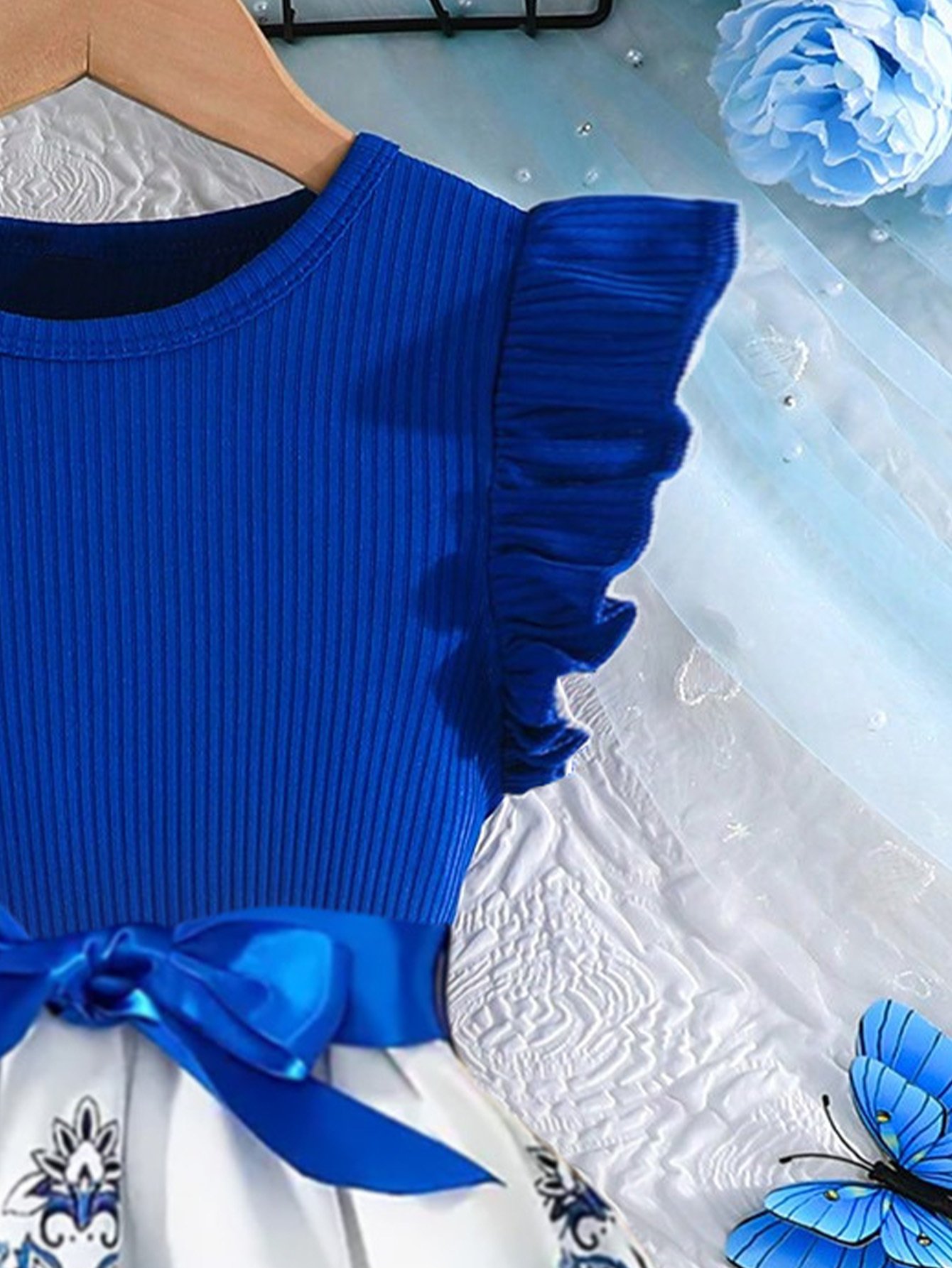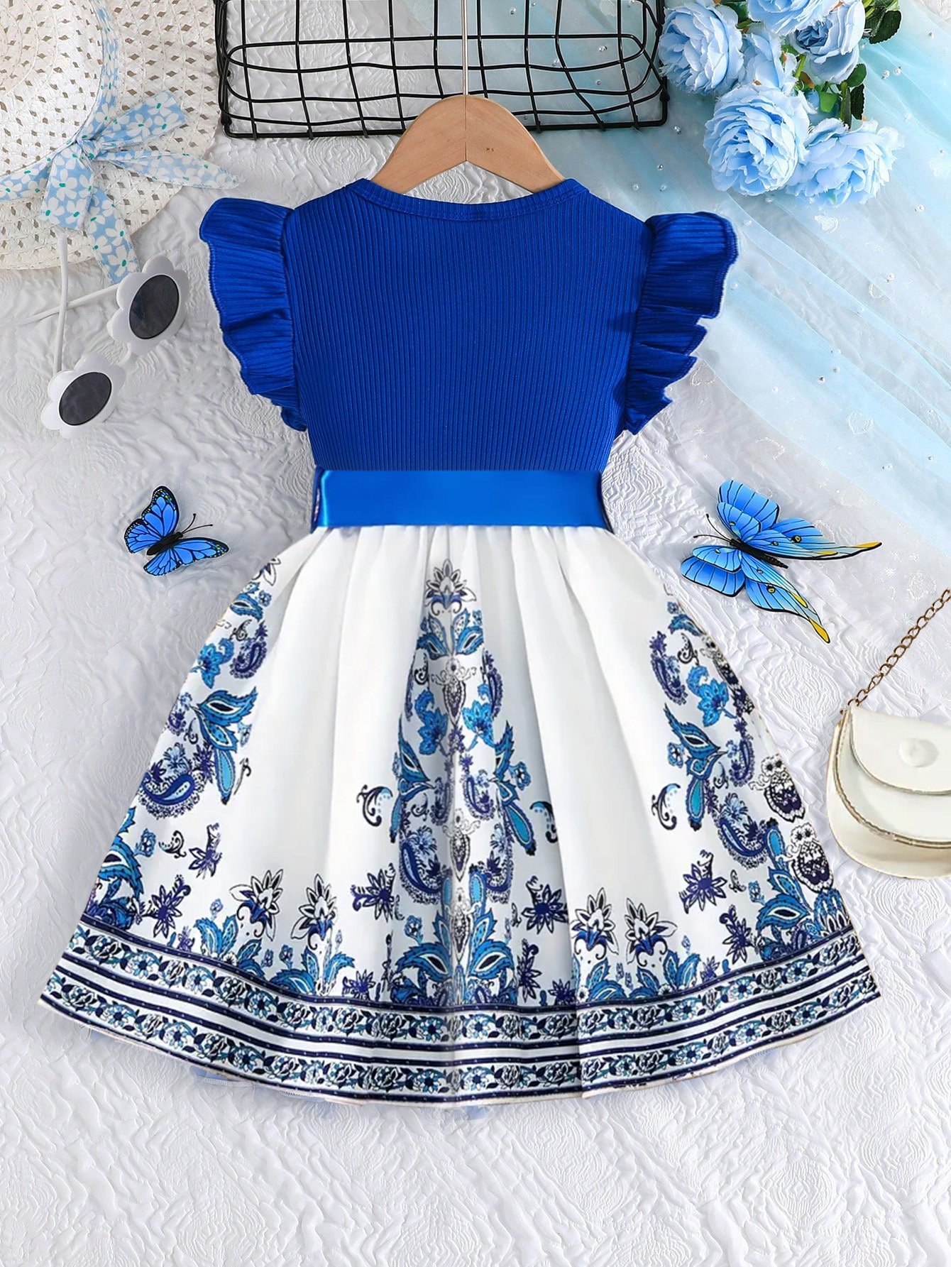 & Little Girls’ Royal Court-Style Princess Dress with Ruffled Short Sleeves & Blue Floral Skirt – Machine-Washable Summer Party Outfit for Performances, Weddings, Photo Shoots, Princess Dress, Performance, Elegant Court Style, Comfortable Fit, Ruffled Hem, Kids Formalwear