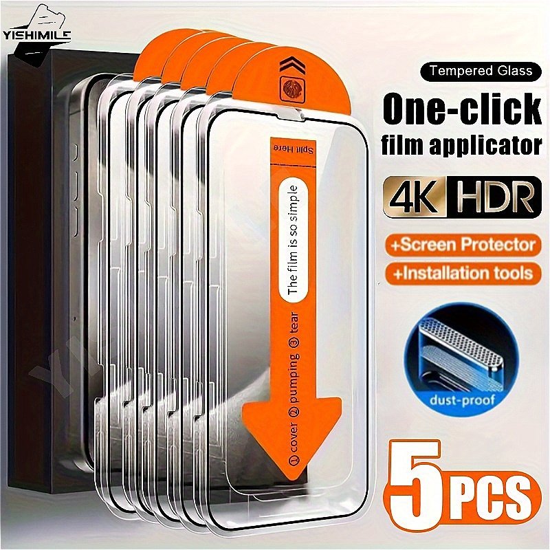 5pcs Ultra HD Tempered Glass Screen Protectors for iPhone 13/13 Pro/13 Pro Max, 14/14 Pro/14 Plus/14 Pro Max, 15/15 Pro/15 Plus/15 Pro Max, 16/16e/16 Plus/16 Pro/16 Pro Max series – One-Click Film Applicator, 9H+ Hardness, Anti-Fingerprint, Full Coverage, Case Friendly, Dustproof Speaker, for iPhone Accessories | Sleek Design | Tempered Glass Protector, for iPhone Accessories