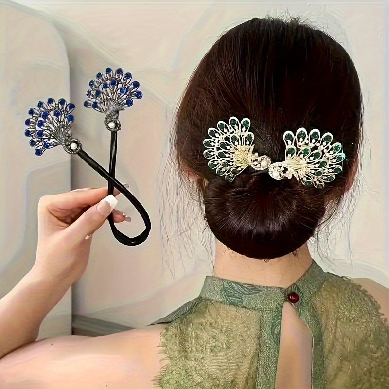 2pcs Set Elegant Peacock Hair Bun Styling Tool- DIY French Hair Clip with Rhinestone Embellishments, Alloy Material, No Batteries Needed- Women’s Fashion Hair Accessories