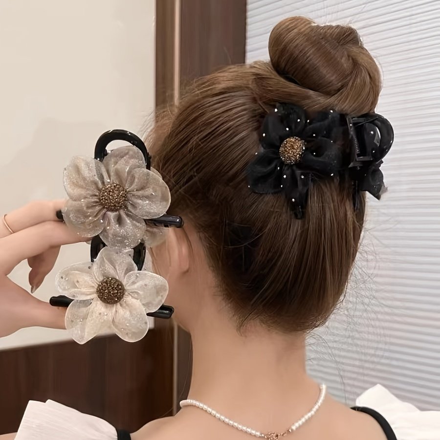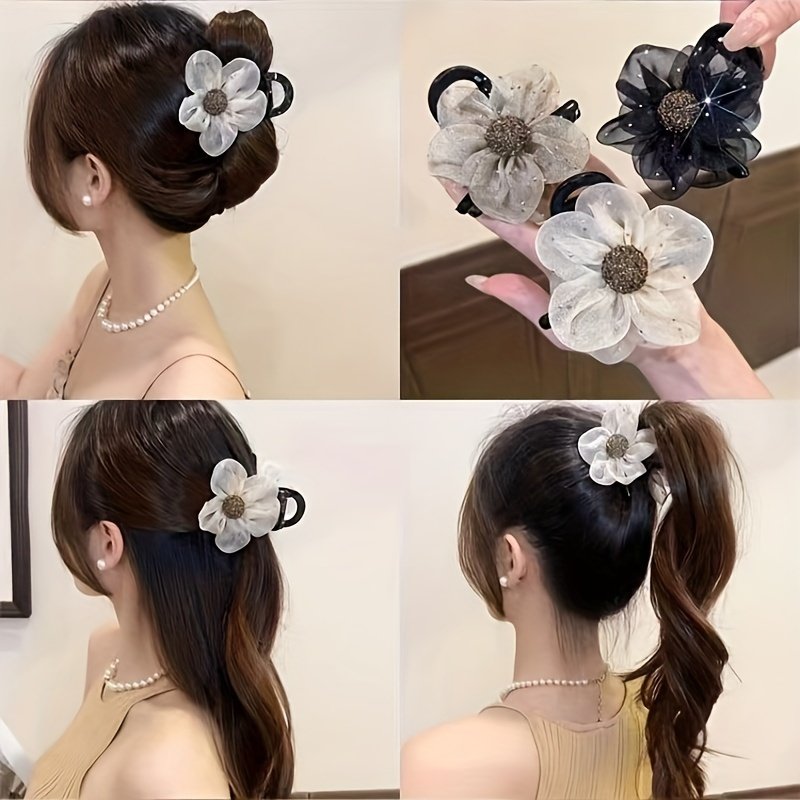 3pcs Elegant Floral Hair Claw Clips with Sparkling Rhinestones – Black and White Lace Flower Design, Perfect for Buns and Ponytails – Stylish Shark Clip Accessories for Women and Teens, Cute Hair Clips, Pontailail Enhancement, Bun Styling Accessory, Rhinestone Embellishments, Sophisticated Craftsmanship