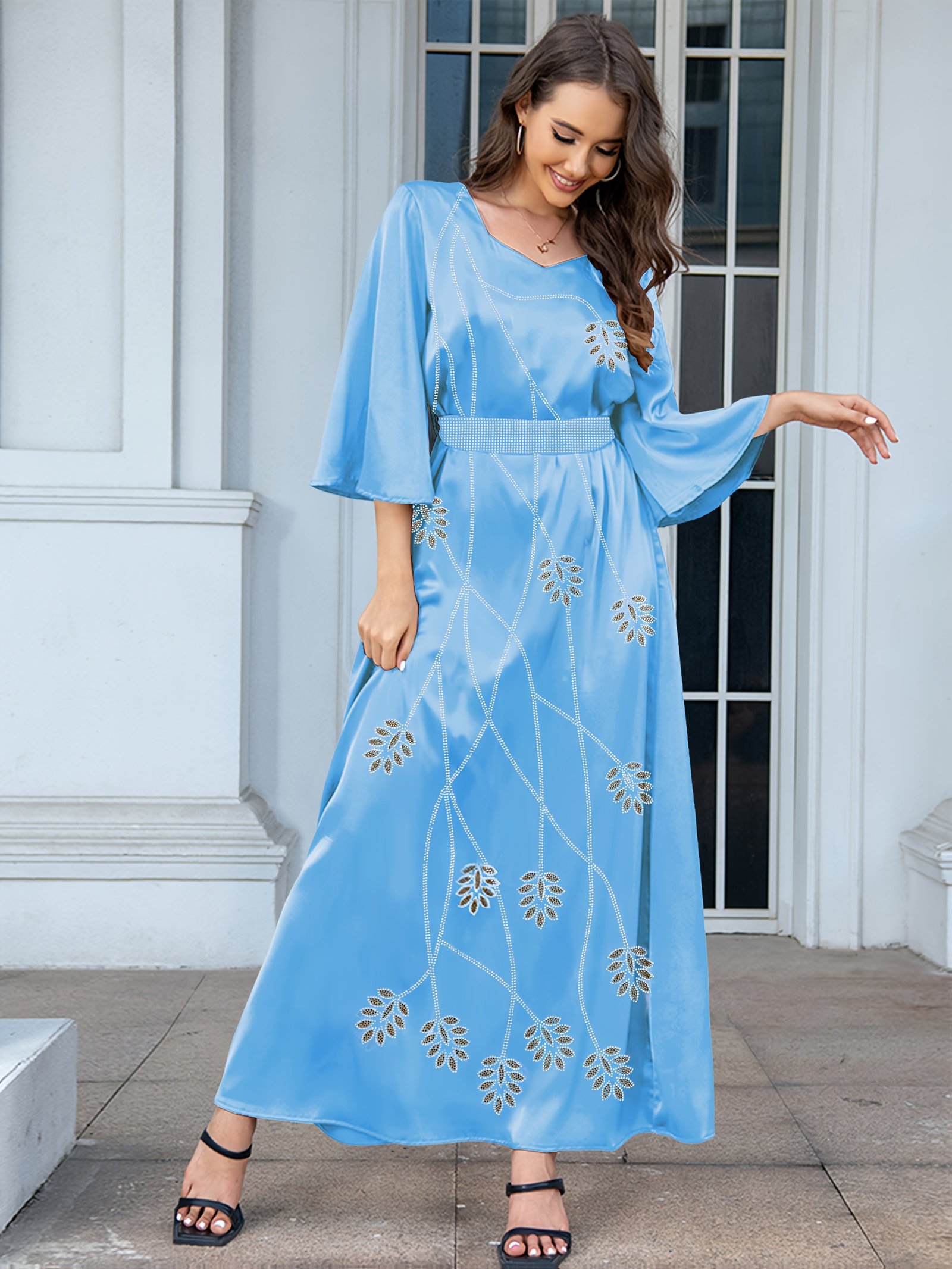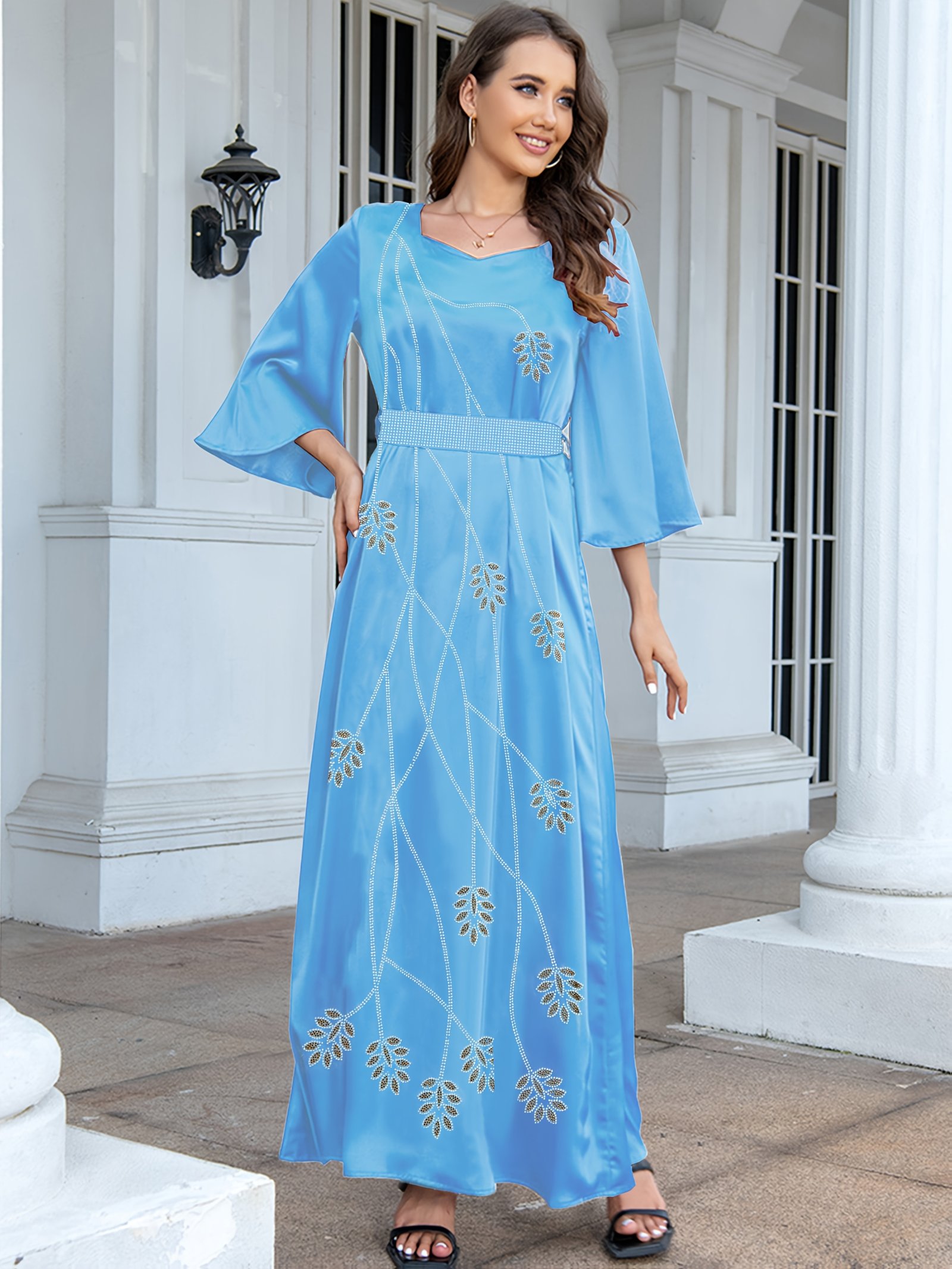 Elegant Blue Floral Patterned Abaya with Rhinestone Belt – Long Sleeve, Floor-Length Dress for Women, Perfect for Casual or Formal Occasions, Formal Attire|Floral Pattern|Rhinestone Accents, Abaya Dress