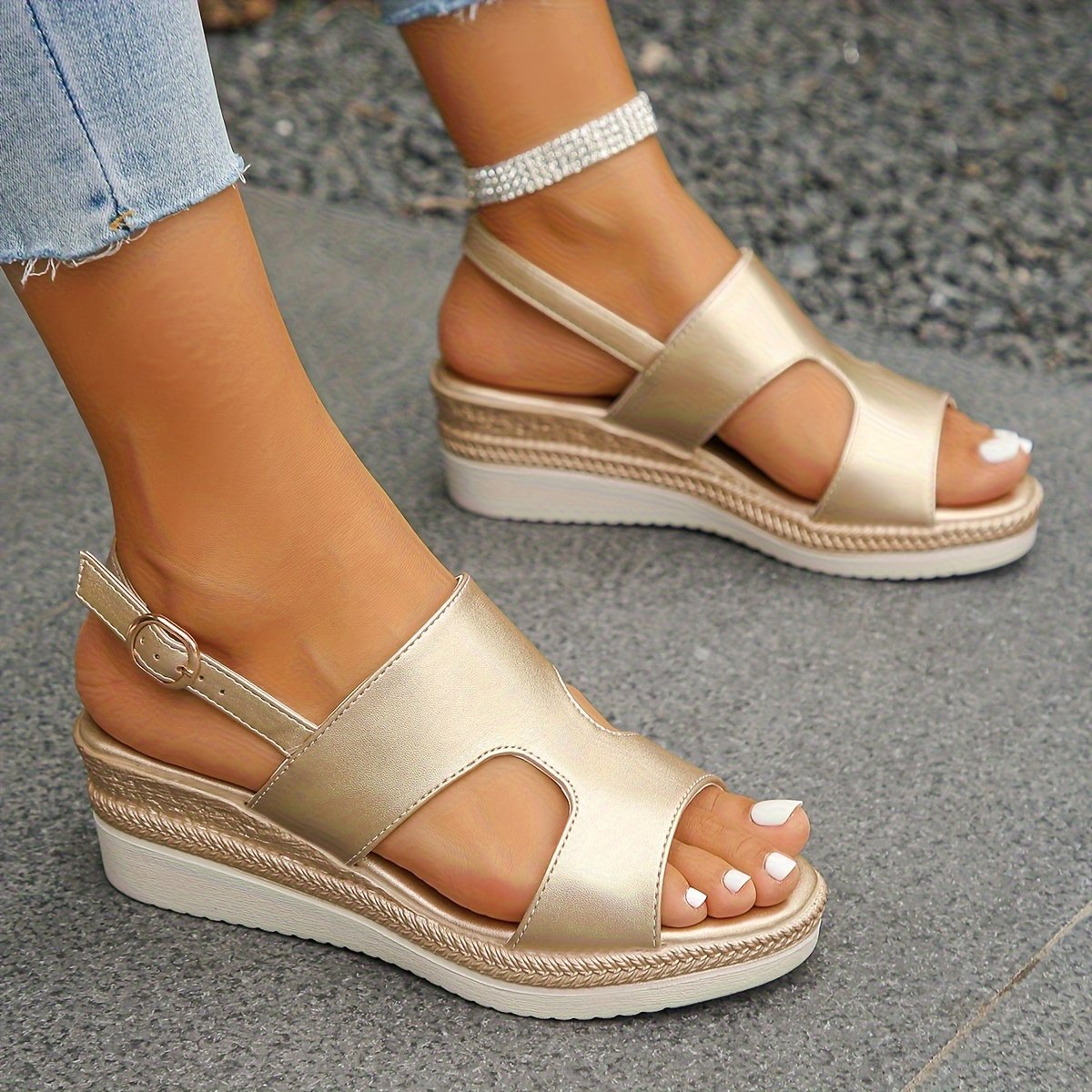 Women’s Golden Ankle-Strap Wedge Sandals with Adjustable Buckle Closure – Open-Toe Summer Beach Shoes, Thick Comfort Sole & Non-Slip Rubber Outsole, Versatile Casual Travel Footwear for Women, Strappy Sandals, Elegant Shoe Design